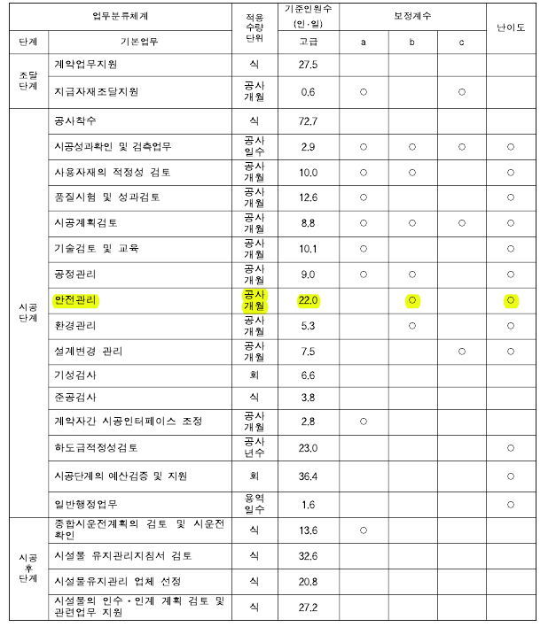 그리고 건설사업관리기술인수 산정기준표에 업무분류체계에서 시공단계에 안전관리 업무에 관한 기준인월수가 다른 업무에 비해 많이 잡혀있는 것을 확인할 수 있습니다.