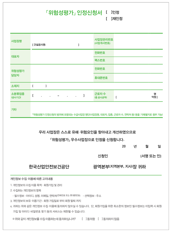 >>위험성평가 인정을 받고자 하는 사업장은 위험성평가 인정신청서를 해당사업장을 관할하는 안전보건공단(http://kras.kosha.or.kr)에 제출하면 됨.
