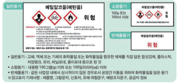 - 산업안전보건법 제115조에 근거하여 사업장에서 물질안전보건자료대상물질을 담은 용기 및 포장에는 경고표지를 부착하여야 하며, 해당 사업장에서 지속적으로 사용하기 위하여 담은 용기에도 반드시 경고표지를 부착하여 사용하여야 함.