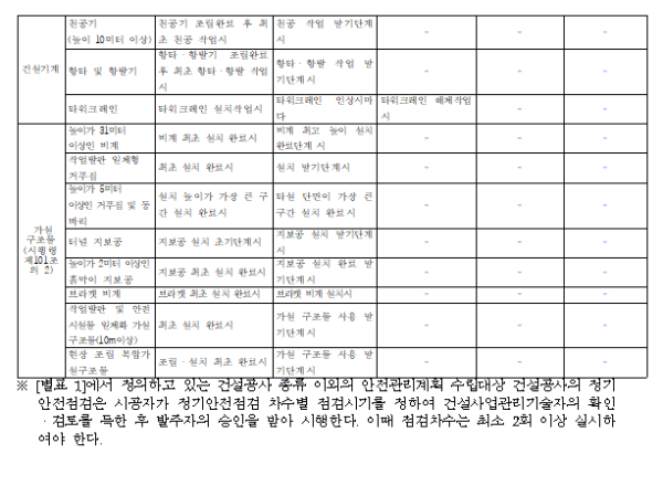 | 정기안전점검 대상 가설 구조물 | -높이가 31미터 이상인 비계 -브라켓 비계 -작업발판 일체형 거푸집 또는 높이가 5미터 이상인 거푸집 및 동바리 -터널의 지보공 또는 높이가 2미터 이상인 흙막이 지보공 -동력을 이용하여 움직이는 가설구조물 -높이 10미터 이상에서 외부작업을 하기 위하여 작업발판 및 안전시설물을 일체화하여 설치하는 가설구조물 -공사현장에서 제작하여 조립,설치하는 복합형 가설구조물 -그 밖에 발주자 또는 인,허가기관의 장이 필요하다고 인정하는 가설구조물 |