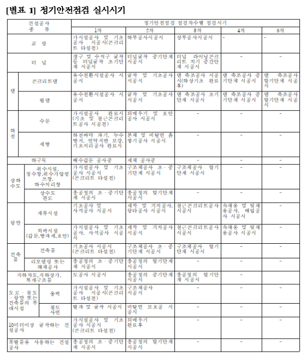 | 관련규정 | -건설기술진흥법 제62조 (건설공사의 안전관리) -건설기술진흥법 시행령 제100조 (안전점검의 시기,방법 등) -건설공사 안전관리 업무수행 지침 |