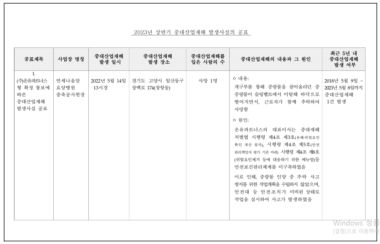 -'중대산업재해 발생사실의 공표"라는 제목