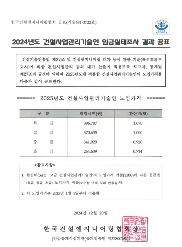 1. 한국건설엔지니어링협회 공표 2025년도 건설사업관리기술인 노임가격