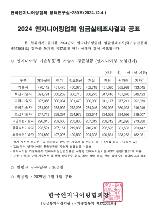 2. 25년도 한국엔지니어링협회 부문별기술자 임금실태조사 공표 자료
