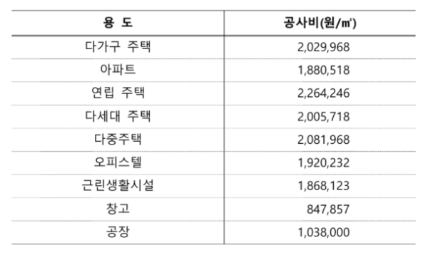 2.한국부동산원 2024년도 건물신축단가표 용도별 평균값