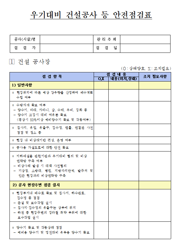 그리하여, 국토 안전관리원이 작성한 우기 대비 건설공사 및 시설물 안전점검표를 공유드리고자 합니다.