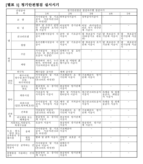 | 공사재개 전 안전점검 | 제1,2종시설물에 대해 공사 중단 후 1년 이상 방치된 시설물 공사재개전 정기안전점검수준 이상 안전점검 | 정기안전점검의 점검항목 |