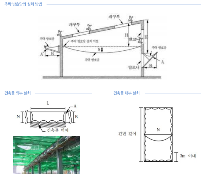 4) 내민보 형상의 지지대를 사용하여 추락 방호망을 설치하는 경우에는 지지대(A) 간의 수평 간격(L)을 제조사가 제시하는 간격이내로 함. 추락 방호망의 짧은 변 길이(N)가 되는 내민 길이(B)는 3미터 이상 설치함.