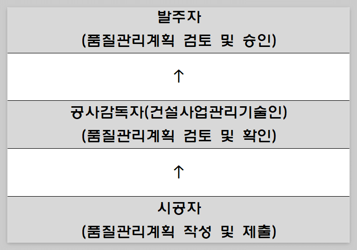 품질 관리를 효율적으로 하기 위해선 당연히 계획이 선행되어야 합니다. 이를 위해서는 발주자, 감리자(건설사업관리자), 시공사의 역할이 명확히 나뉘어 있는데요.